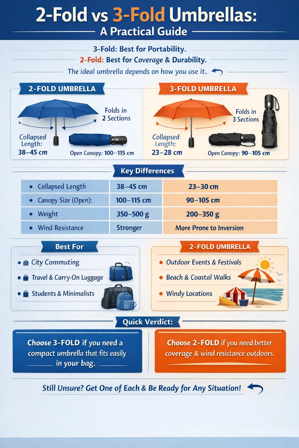 Jika anda memerlukan payung untuk berulang-alik harian, kegunaan pejabat atau perjalanan di mana ruang beg sempit, payung 3 kali ganda hampir selalu merupakan pilihan yang lebih baik . Ia runtuh kepada kira-kira 23–28 cm, muat dalam poket jaket atau beg tangan kecil, dan cukup ringan untuk dibawa tanpa disedari. Sebaliknya, jika anda menghabiskan banyak masa di luar rumah — sama ada anda menuju ke pantai, stadium atau pesta negara — payung 2 kali ganda memberi anda kanopi yang lebih besar, bingkai yang lebih kukuh dan rintangan angin yang lebih baik, dengan kos yang lebih besar untuk dibawa.