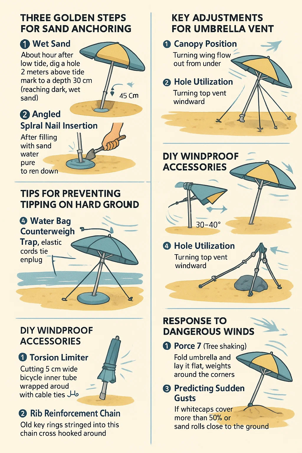 Berikut adalah petua pemasangan praktikal untuk memastikan a payung pantai stabil dan angin: