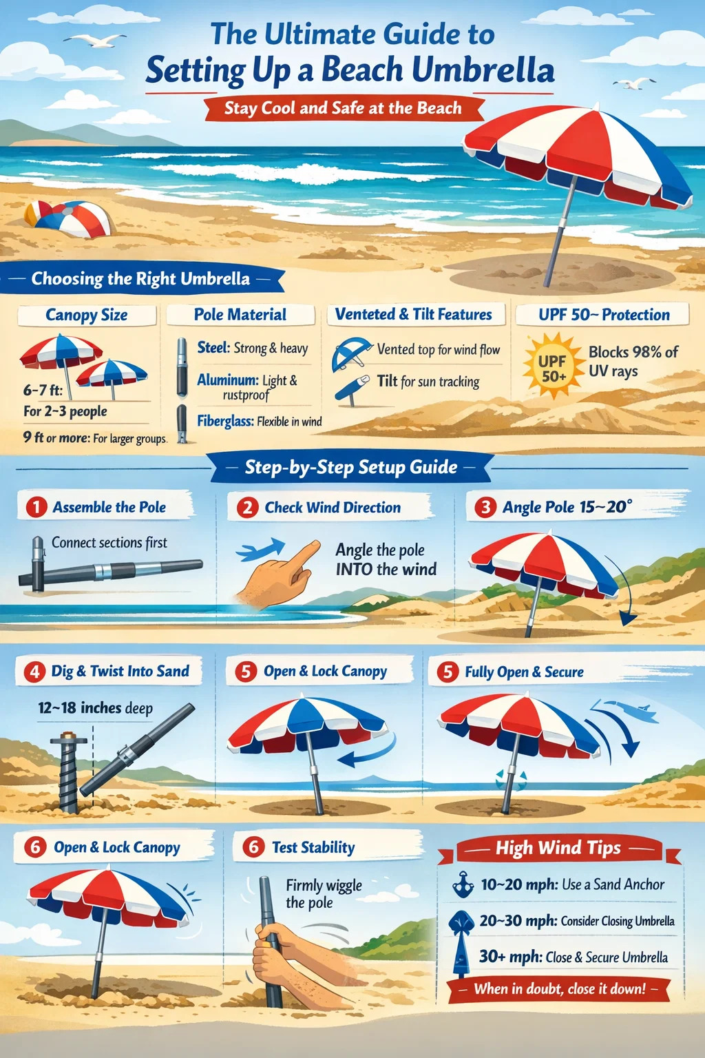 Panduan ini merangkumi setiap langkah secara terperinci — daripada memilih payung pantai yang betul hingga memastikan ia stabil dalam tiupan lebih 20 mph — supaya anda boleh menghabiskan lebih sedikit masa untuk bergelut dengan peralatan dan lebih banyak masa menikmati air.