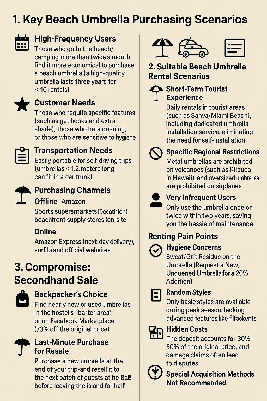 Memperoleh a payung pantai Memerlukan fleksibiliti berdasarkan kekerapan penggunaan, sifat perjalanan, dan anggaran. Berikut adalah analisis empirikal: