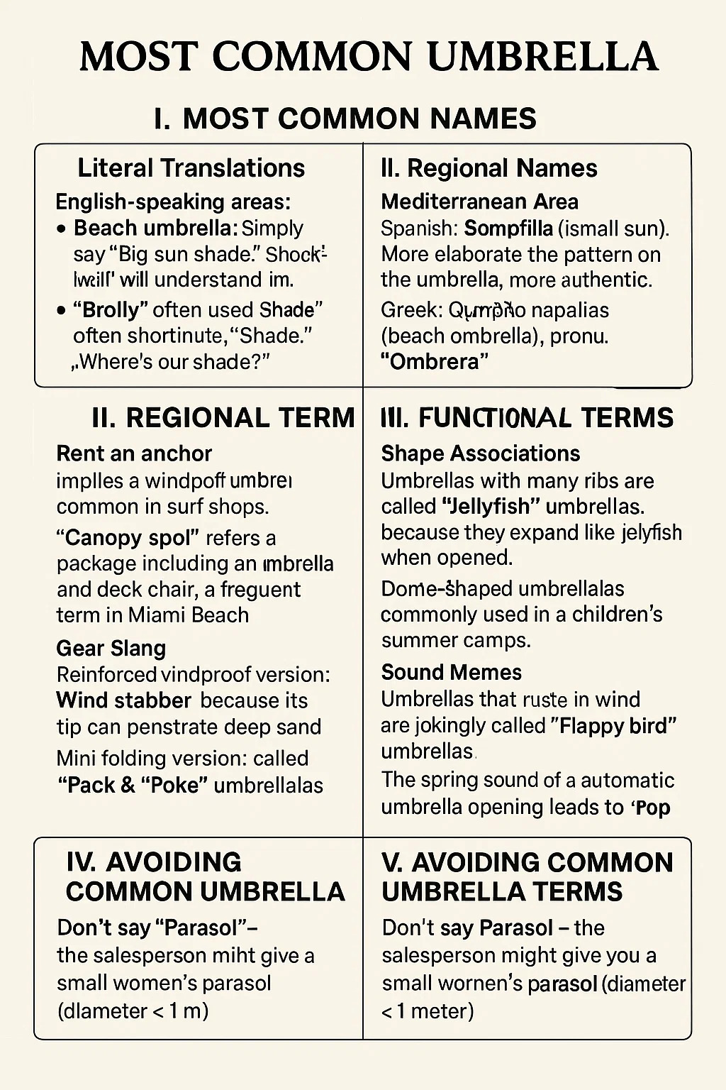 Kawasan berbahasa Inggeris: Cukup katakan "payung pantai." Penjaga kedai akan memahami dengan serta -merta.