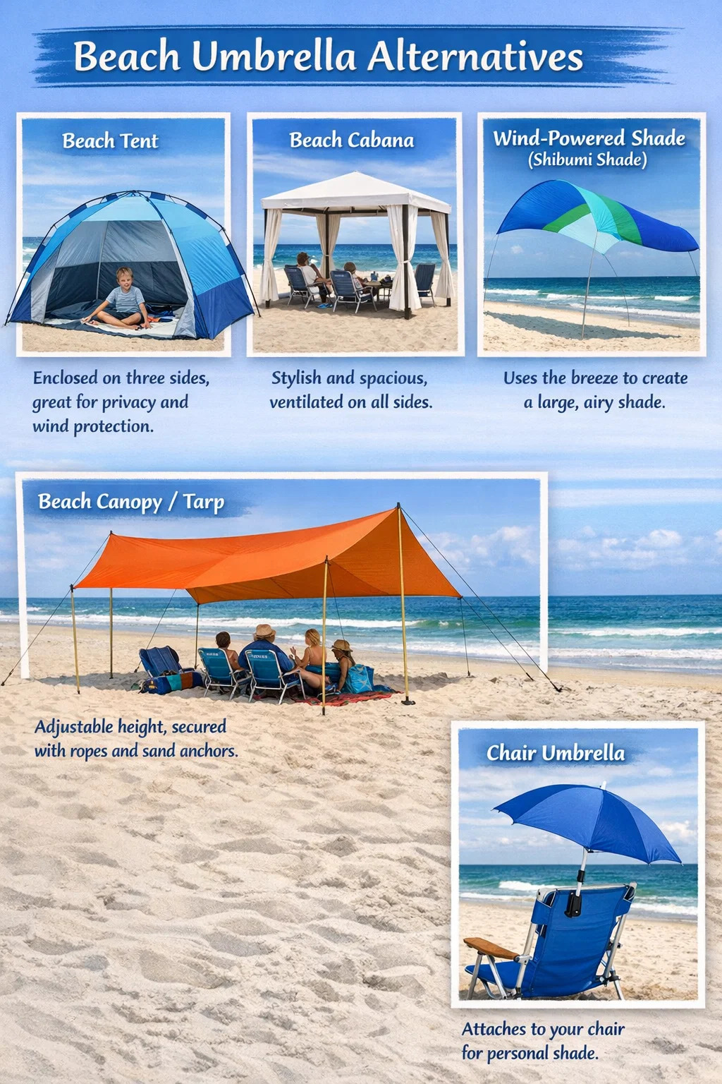 Jika anda mendapati membawa atau menyediakan payung pantai terlalu menyusahkan, atau bimbang ia diterbangkan angin, terdapat banyak alternatif yang lebih stabil dengan kawasan berlorek yang lebih besar tersedia di pasaran.