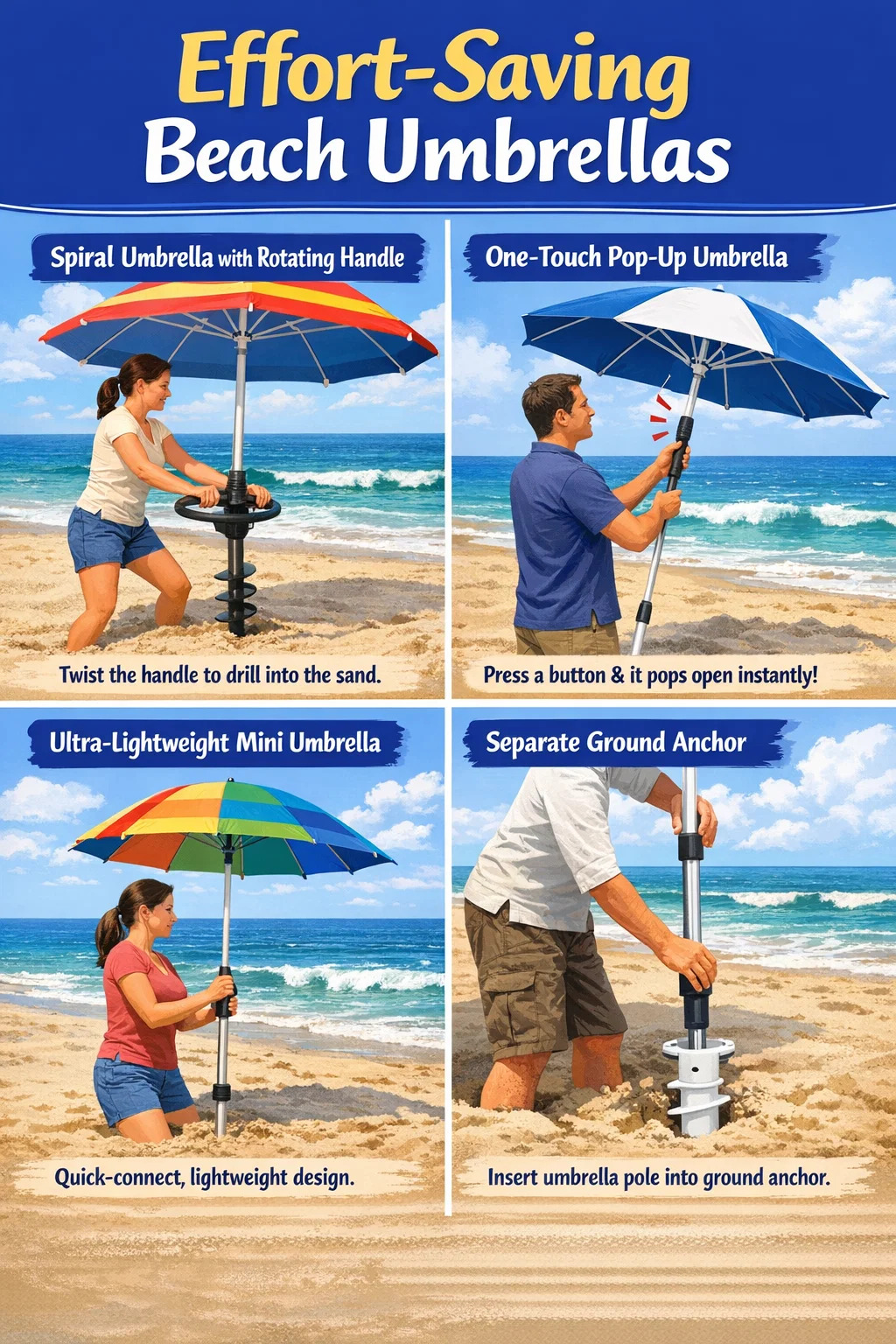 Faedah penjimatan usaha: Menggunakan prinsip leverage, wanita atau orang tua yang kurang kekuatan boleh dengan mudah menanam payung jauh di dalam pasir.