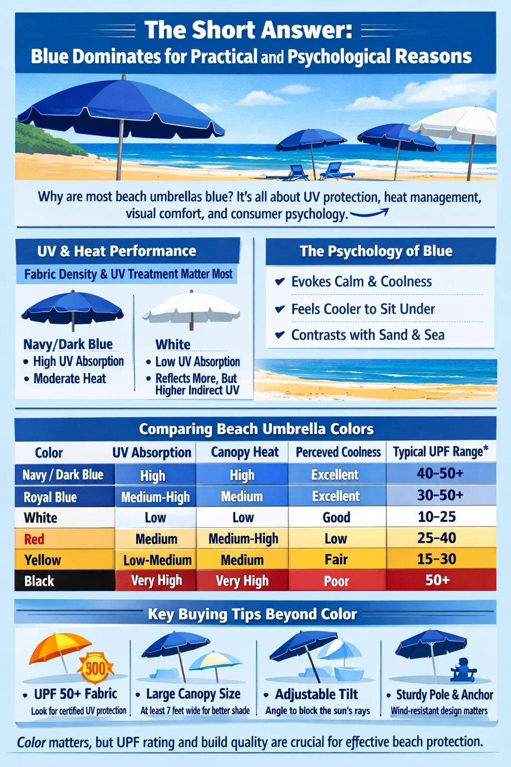 Untuk memahami sebab warna biru menjadi pilihan untuk payung pantai, anda perlu melihat cara warna berinteraksi dengan cahaya matahari, cara mata manusia bertindak balas terhadap persekitaran luar dan perkara yang ditemui oleh pengeluar tentang psikologi pelanggan apabila menjual produk teduhan bermusim.